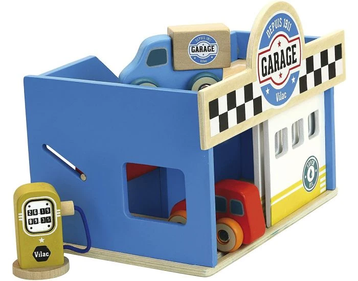 Un petit garage en bois de la gamme Vilacity, idéal pour les tout petits. Ce petit garage d’apprentissage en bois est livré avec une pompe à essence, un camion et une voiture. Il dispose de portes coulissantes, d’une rampe d’accès au parking et d’un rouleau de lavage auto.