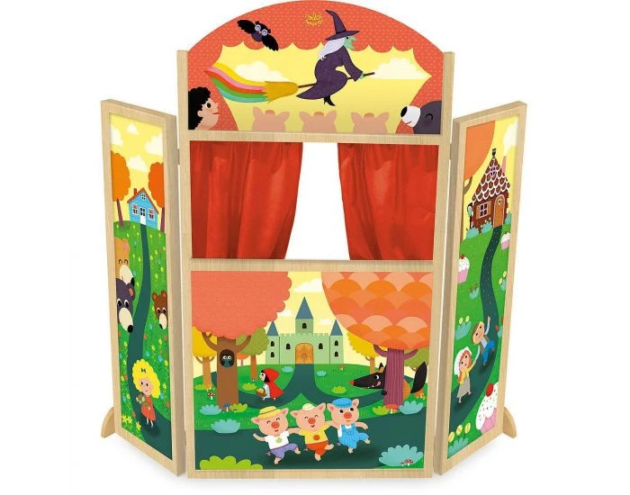 Voici un magnifique théâtre en triptyque dont les héros de contes constituent le décor : le petit chaperon rouge, les trois petits cochons, boucle d’or…