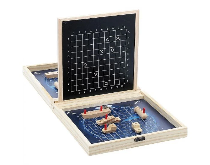 Cette bataille navale est l’occasion de faire des parties palpitantes à deux, avec 5 navires à dégommer pour chaque joueur. Chacun de leur côté, les joueurs disposent leurs bateaux sur la grille. Chaque joueur doit faire couler la flotte adverse en ciblant 1 à 1 les points sur la grille. Des petits jetons permettent d’indiquer les navires touchés et une craie permet d’inscrire l’évolution des tirs sur le quadrillage vertical. Le vainqueur est le premier ayant fait couler tous les navires de son adversaire. Touché, coulé !
