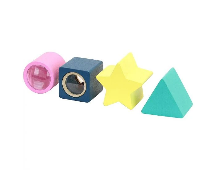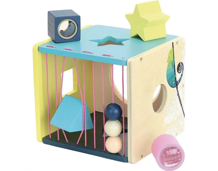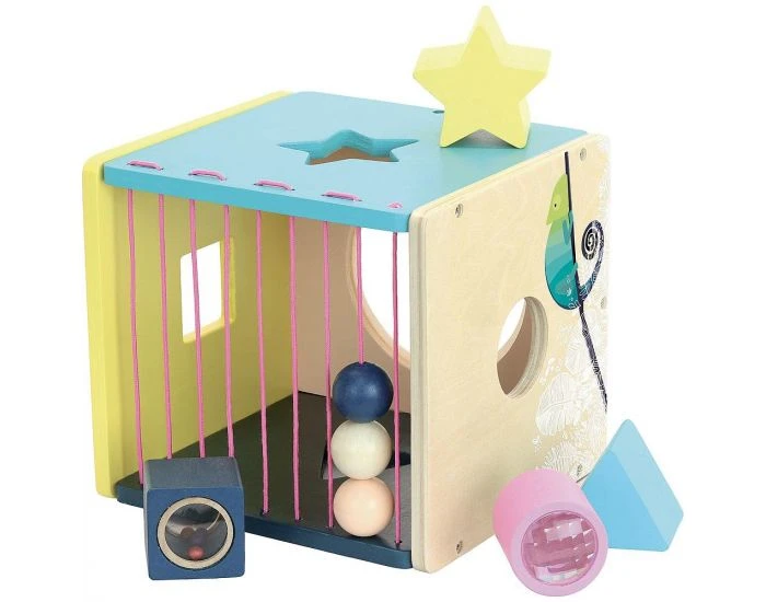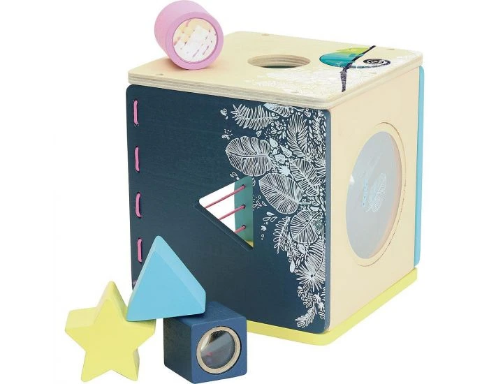Cette boîte dispose de 4 accessoires ludiques pour amuser bébé : cylindre kaléidoscope, cube maracas, étoile et triangle sonore.