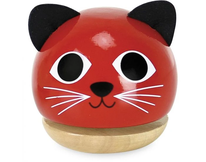 Boîte à musique en bois tourné et laqué en forme de tête de chat qui tourne sur elle-même.