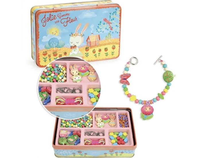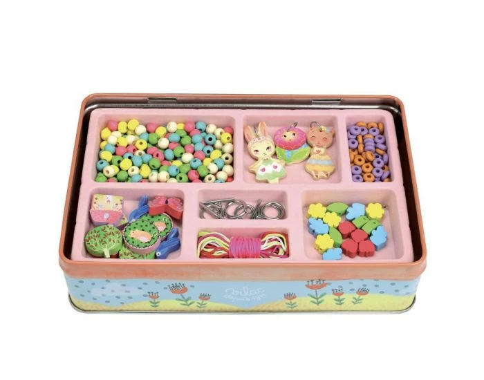 De jolies perles en bois de différentes tailles avec des pendentifs très originaux, dans une boîte en métal sur le thème du jardin, pour faire des colliers et des bracelets.
