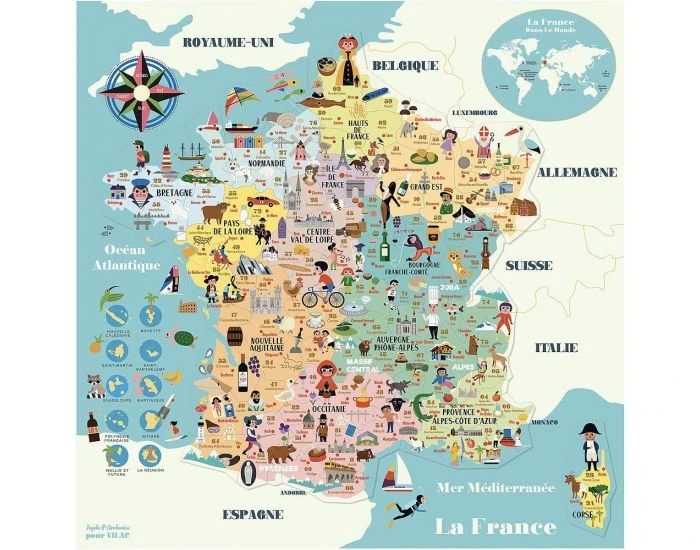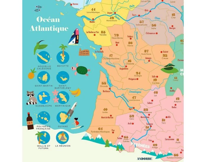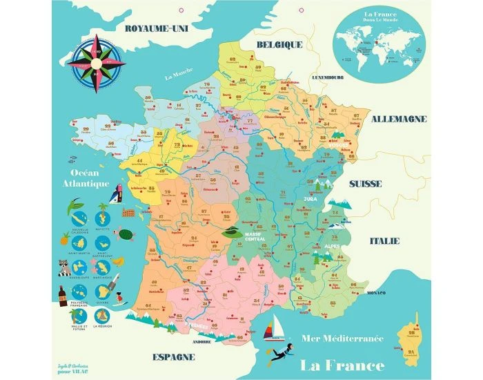 Elle est idéale pour apprendre les nouvelles régions, le nom des départements et leurs spécialités, les principales villes, les fleuves, les rivières, les reliefs, les territoires d’outre-mer, les mers et océans ainsi que les pays limitrophes.