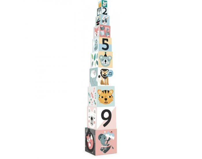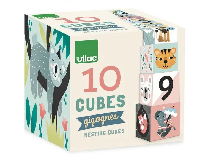 10 cubes gigognes en carton, illustrés par la nouvelle artiste de la marque Vilac, Michelle Carlslund.