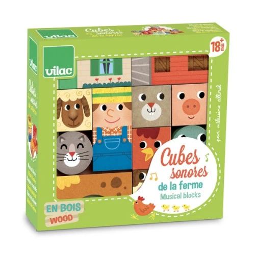 Cubes sonores de la ferme, un jouet en bois de la marque Vilac. Référence 2102.