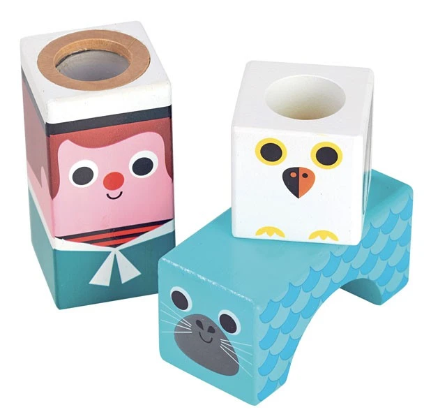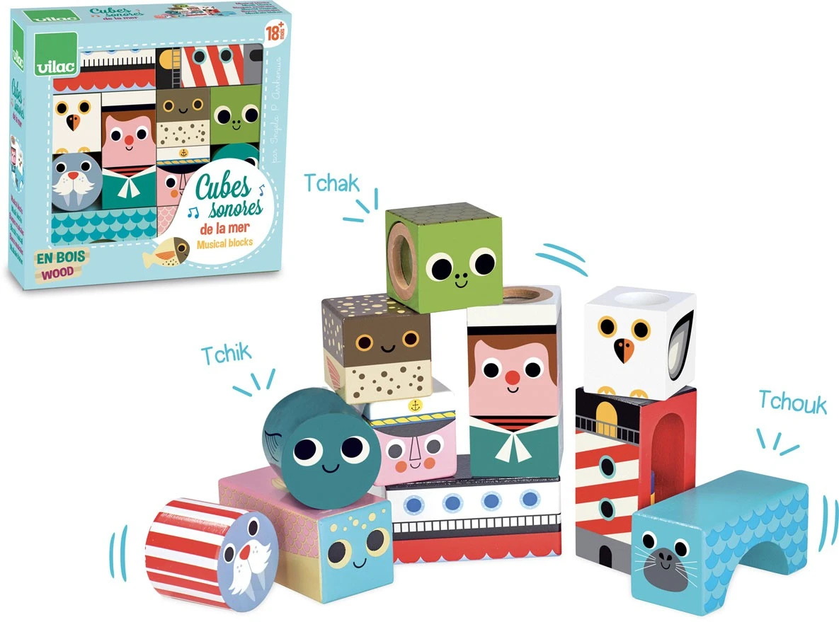 Apprendre à toucher, manipuler tout en découvrant des sons ? C’est possible avec les cubes sonores de la mer de la marque Vilac. Référence 7718.