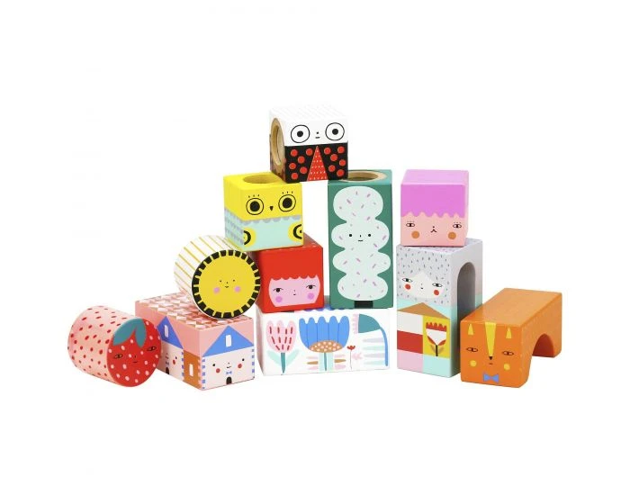 Apprends à toucher et à manipuler tout en découvrant des sons grâce à ces 11 cubes sonores en bois illustrés par Suzy Ultman.