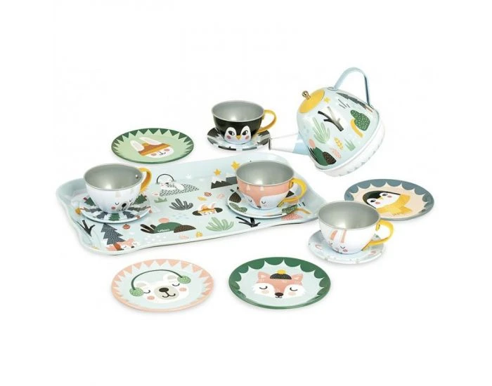 14 pièces en métal constituent cette dinette musicale illustrée sur le thème de la banquise par l’artiste Michelle Carlslund. Lorsque vous penchez la théière pour servir vos petits invités, une jolie mélodie se déclenche.