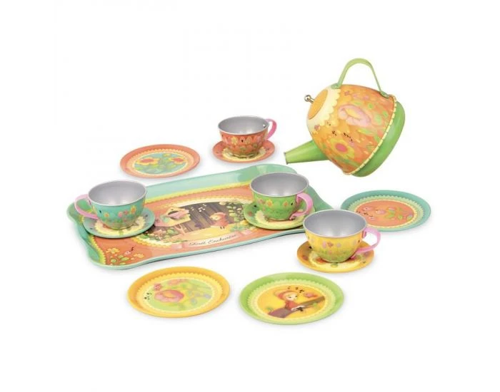 14 pièces en métal constituent cette dinette musicale. Lorsque vous penchez la théière pour servir vos petits invités, une jolie mélodie se déclenche.