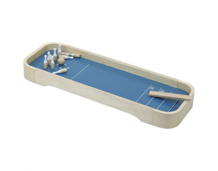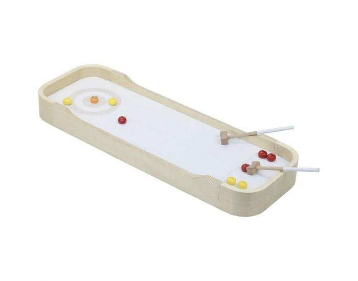 Une grande piste de mini-bowling au recto et de curling au verso. Le Grand Bowling & Curling est livré avec ses accessoires en bois et plastique : 10 quilles, 2 boules et un lanceur, 8 pucks curling, 1 but et 2 cannes de jeux.