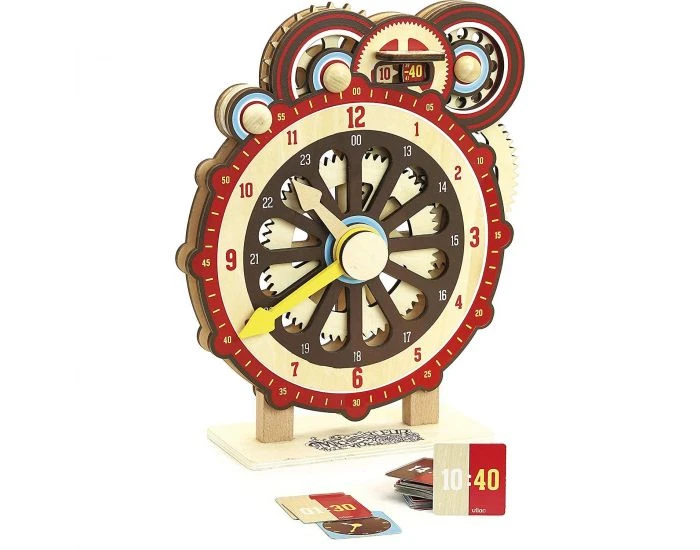 Une horloge d’apprentissage en bois compressé décoré, à poser ou à accrocher au mur. Livrée avec ses cartes Quizz réversibles pour définir les heures et un livret d’accompagnement. A partir de 6 ans.