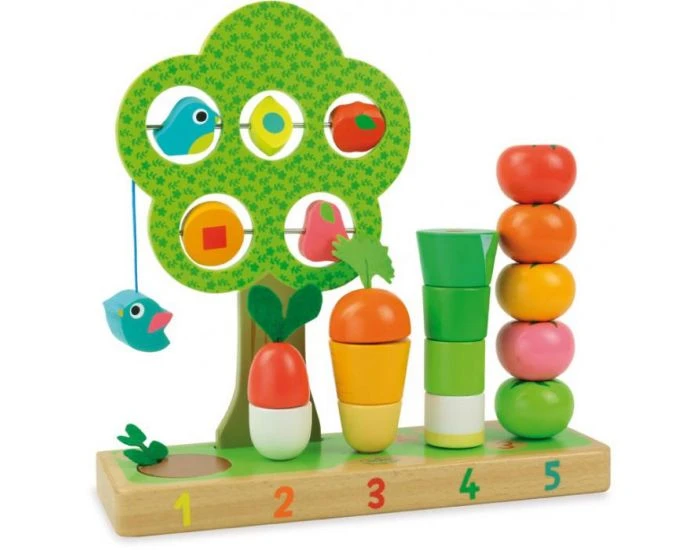 En bois peint et laqué à l’aide de produits non toxiques et adaptés à la manipulation par l’enfant, ce jouet enseigne les chiffres peints sur le socle, les formes géométriques cachées dans l’arbre et les légumes simples que l’enfant commence à apprécier dans son assiette : pomme de terre, radis, carotte, poireau et tomates, à empiler ou à planter dans le socle.