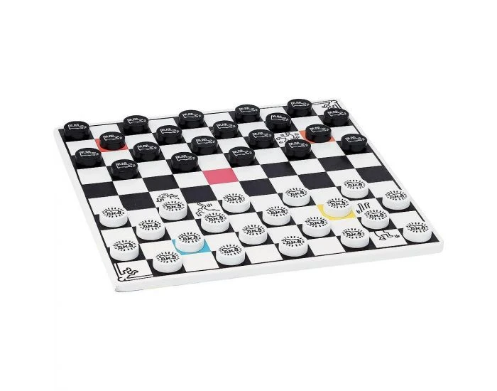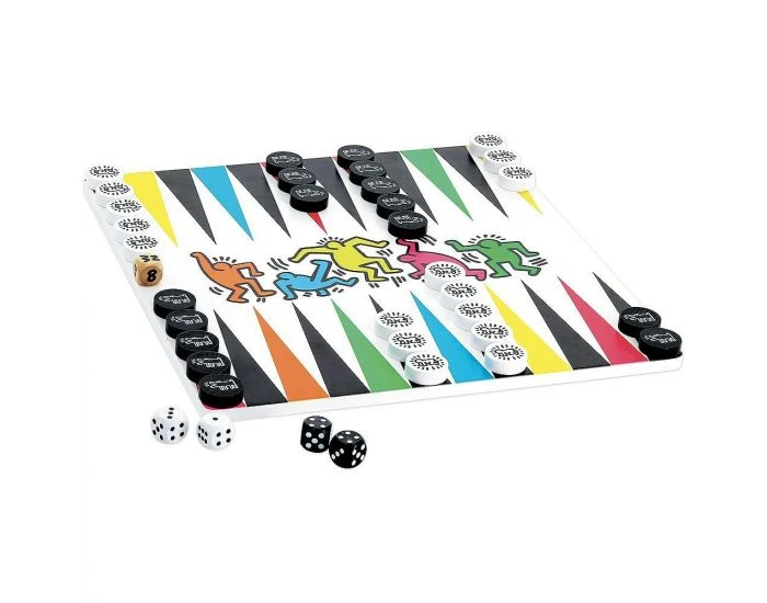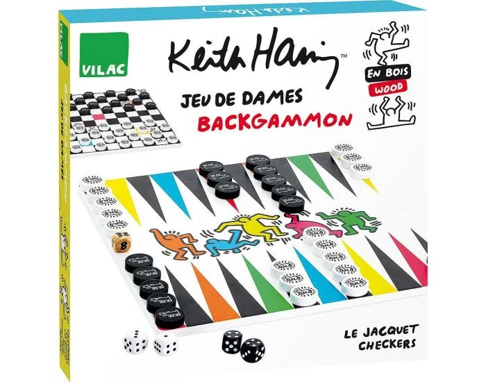 Deux jeux de stratégie réunis dans un coffret de jeux 2 en 1 : le jeu de dames et le jeu de backgammon, reprenant les dessins originaux de l’artiste Keith Haring.