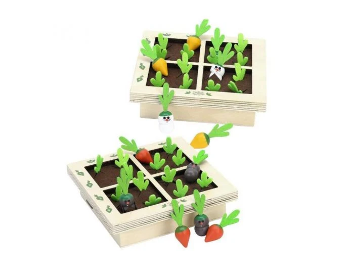 Contenu : 24 carottes, 8 taupes, deux mini-potagers en bois et feutrine.
