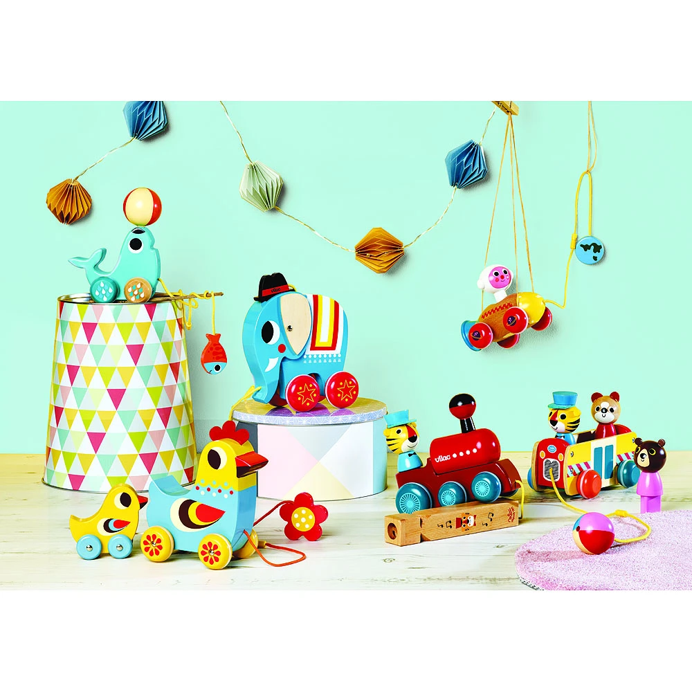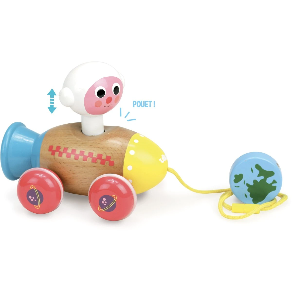 Les enfants pourront promener cette fusée et son astronaute partout dans la maison. Le petit plus qui les amusera : un « pouic-pouic » qui retentit lorsque l’on appuie sur sa tête ! Un clip sur le fil assure la sécurité des petits.