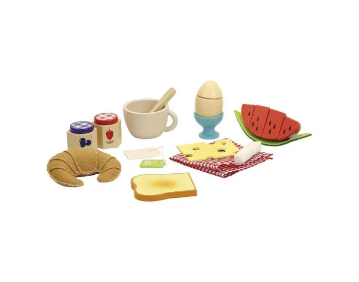 Un set petit déjeuner original avec un oeuf à découper dans lequel on trempe sa mouillette, 1 tartine, du fromage, un croissant, des pots de confitures à ouvrir, 1 tasse de thé et son sachet, ainsi qu’une pastèque à découper…
