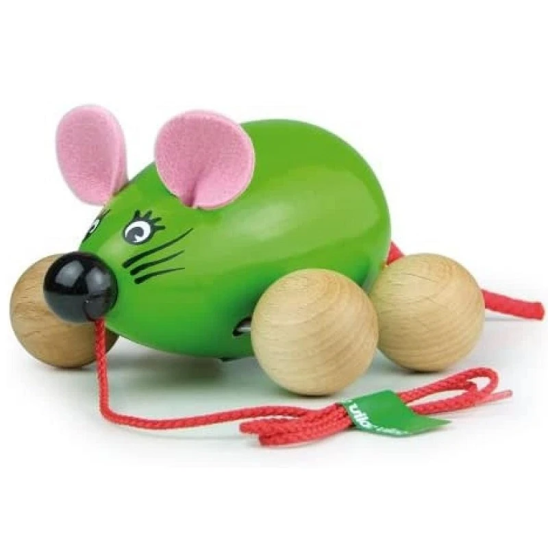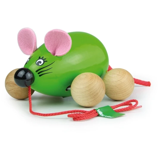 Jolie souris en bois verte, un jouet à tirer fabriqué en France dans le Jura par Vilac.