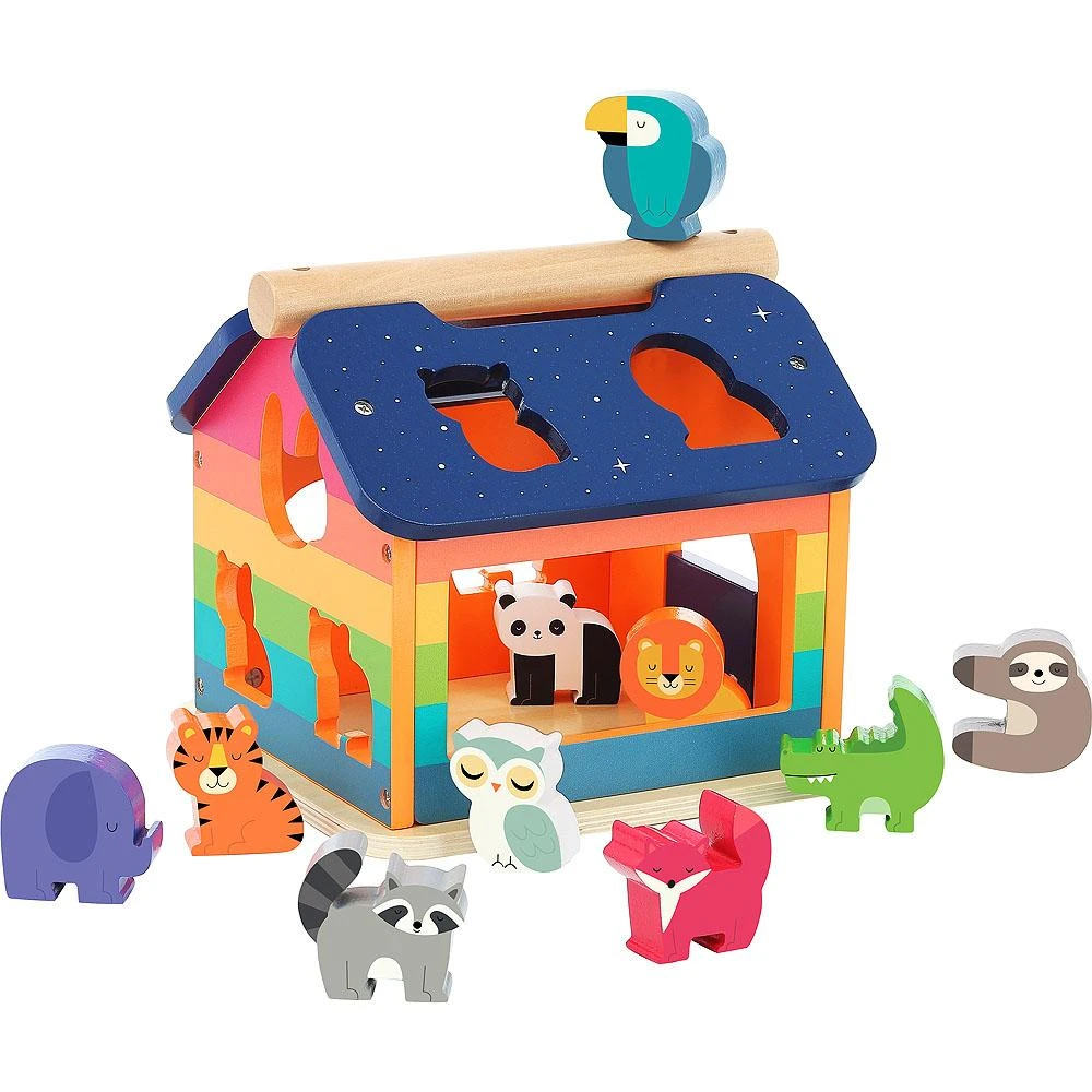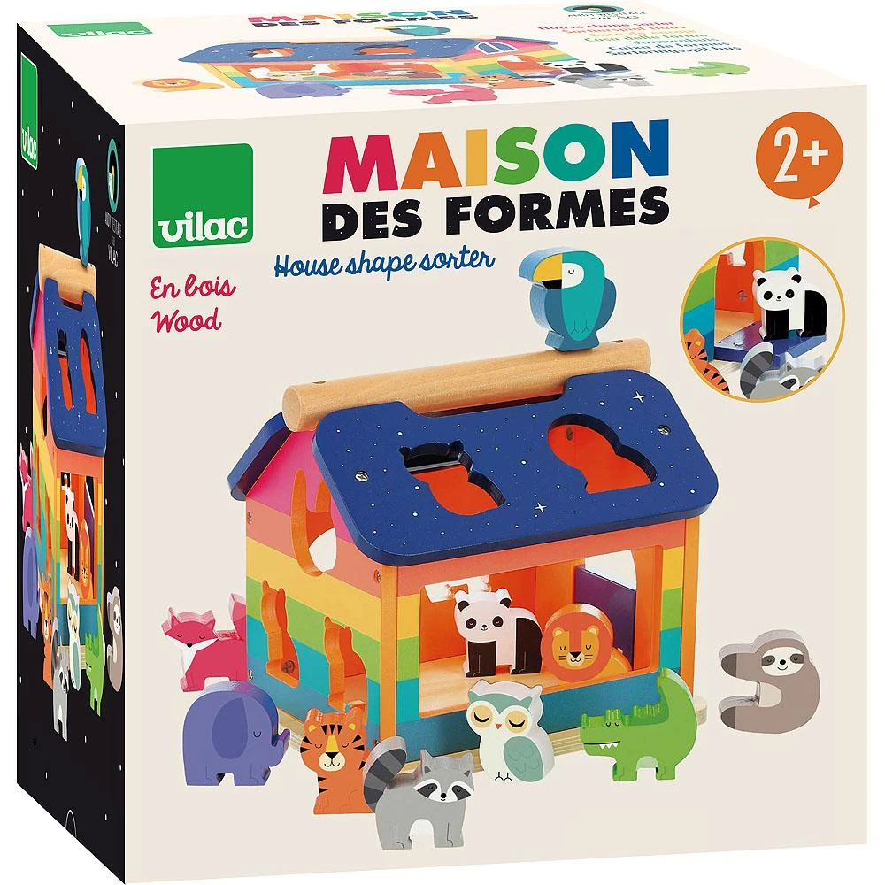 Cette jolie boite à formes de la marque Vilac, illustrée par Andy Westface, est une boîte à formes originale et ludique. Elle se compose d’une maison en bois dotée d’une porte qui bascule grâce à une charnière élastique (qui évite les pincements) et de 10 animaux en bois peints et imprimés.