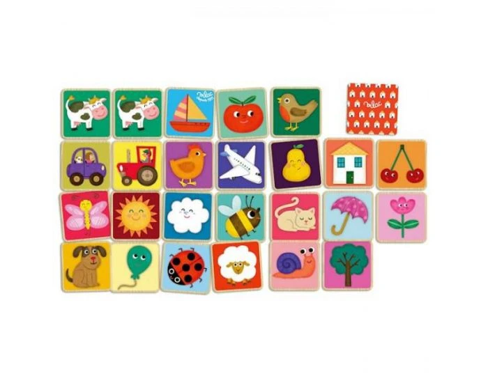 Un jeu de mémo imagier constitué de 48 pièces en bois qui se rangent dans un joli coffret en bois.