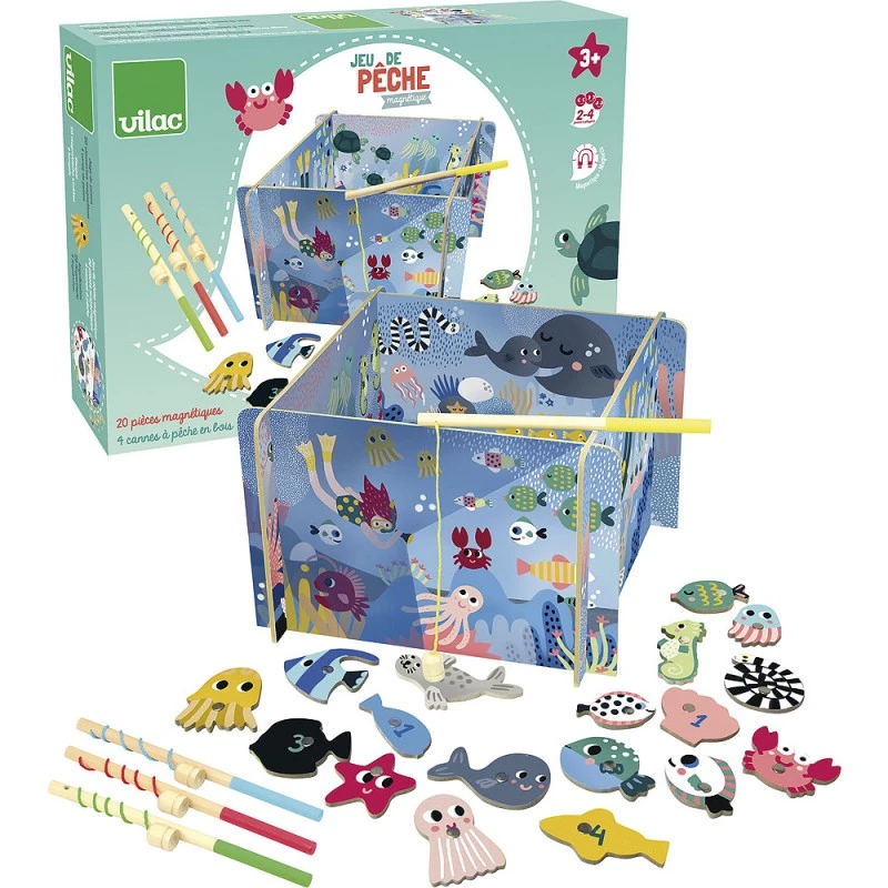 Ce jeu de pêche à la ligne magnétique contient 4 cannes à pêches en bois et 20 pièces aimantées à pêcher. A partir de 3 ans.