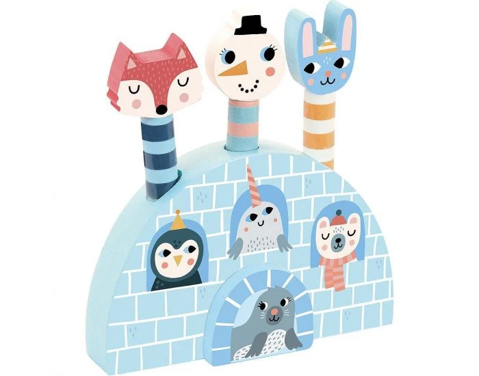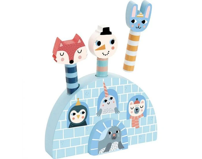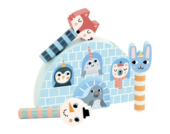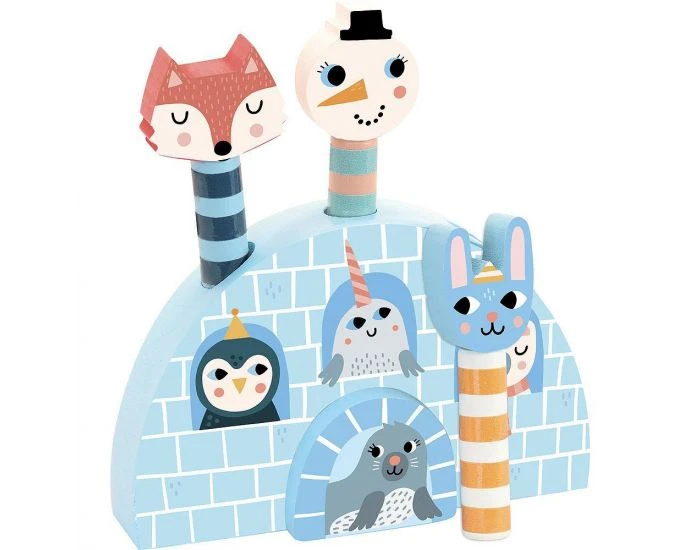 Découvre ce joli jouet pop-up illustré par Michelle Carlslund, composé d’un igloo en bois avec 3 personnages : un renard malin , un lapin coquin et un bonhomme de neige.