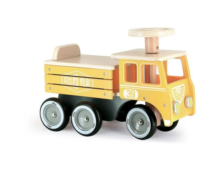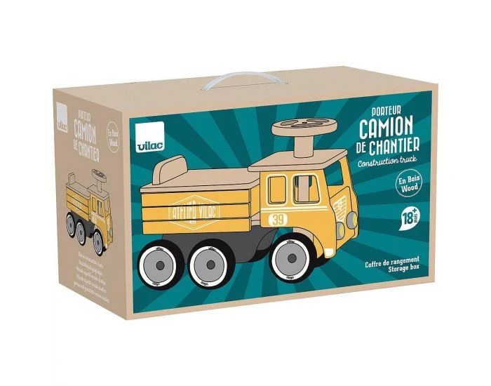 C’est parti pour une balade sur ce joli porteur camion de chantier en bois de la marque Vilac !