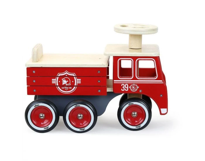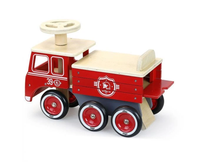 C’est parti pour une balade sur ce joli porteur camion de pompier en bois de la marque Vilac !