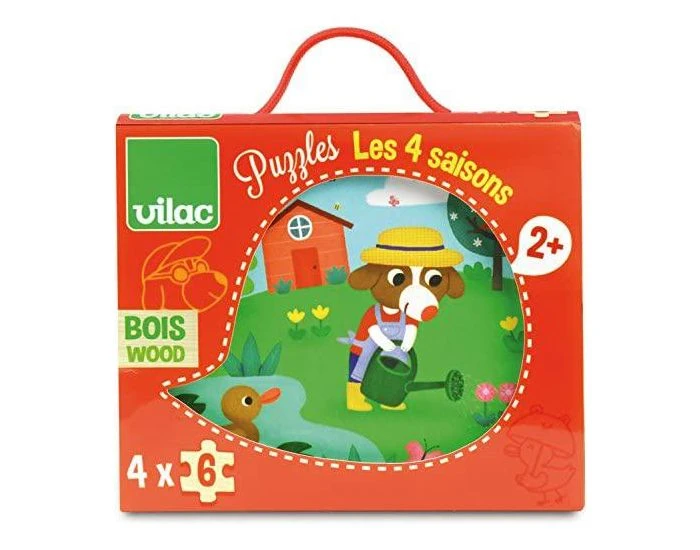 Joli coffret en bois contenant 4 puzzles en bois de 6 pièces sur le thème des quatre saisons.