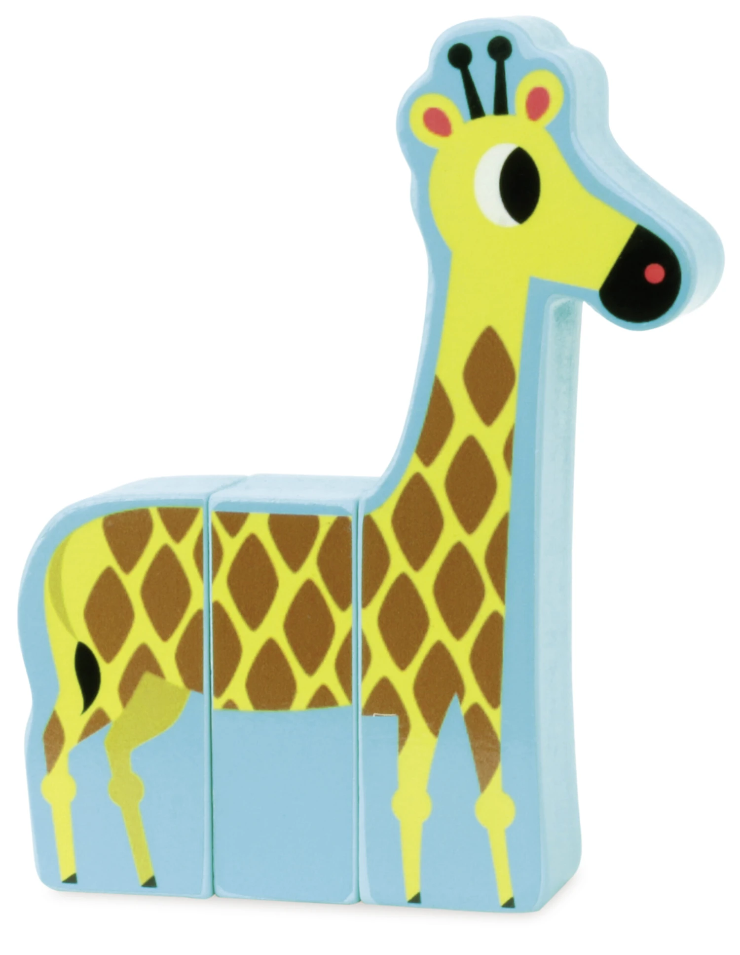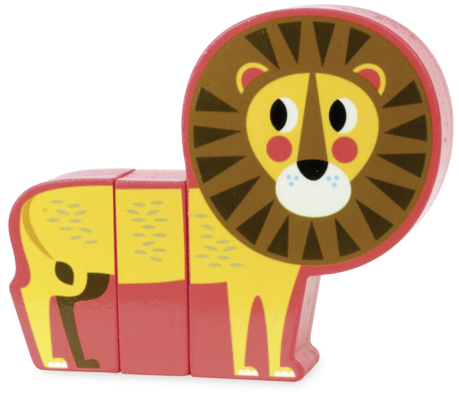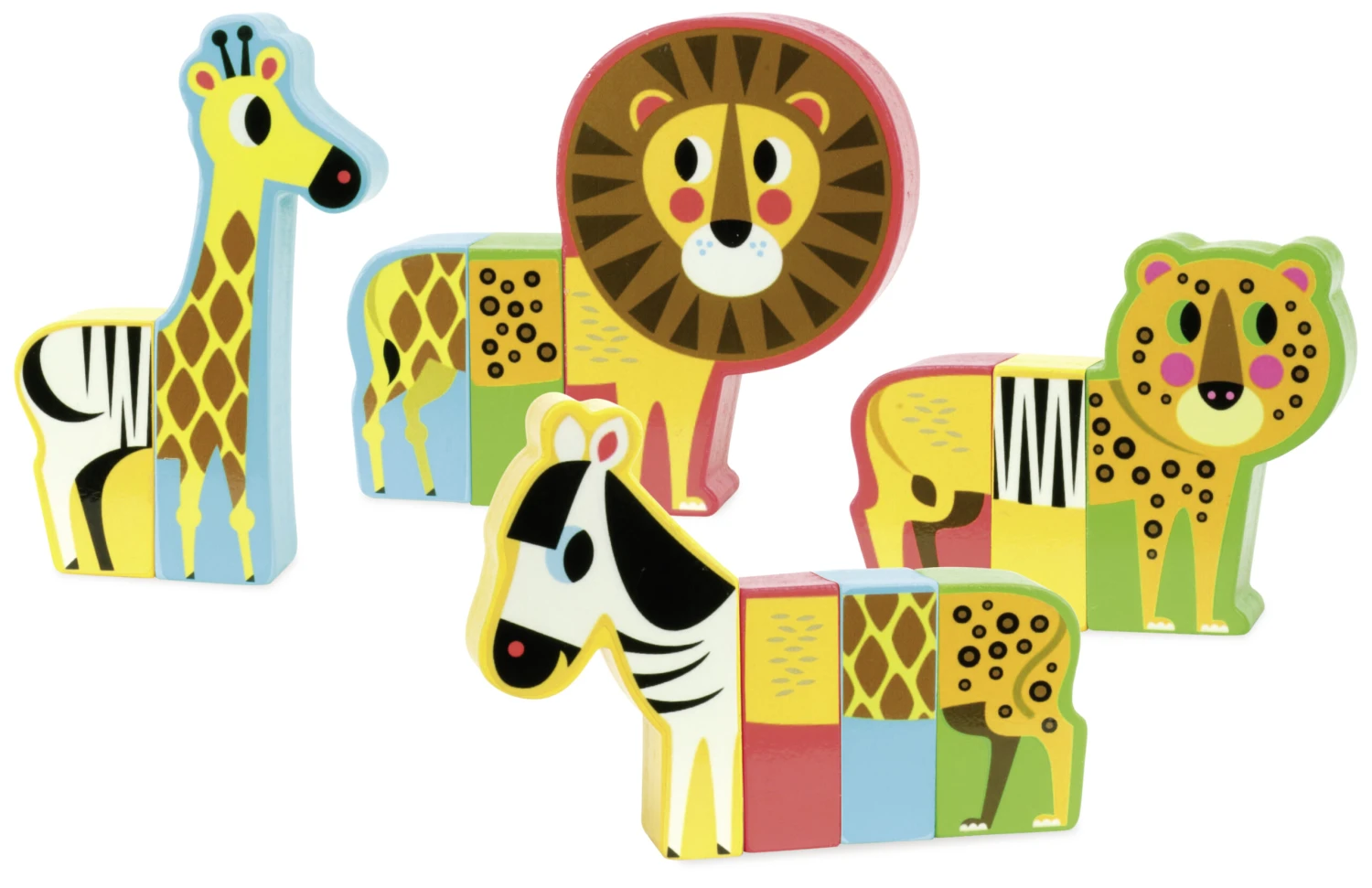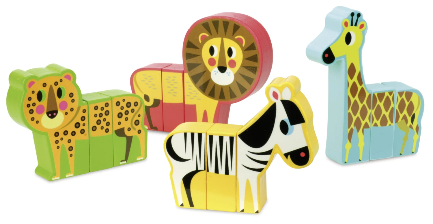 Quatre animaux en bois dont les 12 éléments aimantés détachables peuvent être mélangés pour créer des animaux imaginaires très amusants .