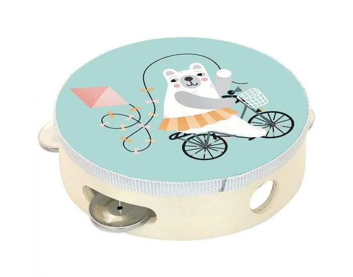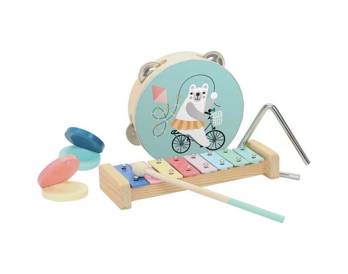 Découvrez ce joli set d’éveil musical illustré par Michelle Carlslund et composé de 5 jouets musicaux : un tambourin, un métallophone, deux castagnettes et un triangle.