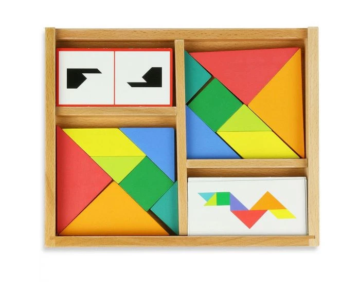 Un jeu de Tangram en bois de 4 niveaux pour des combats de plus en plus corsés de la marque Vilac.