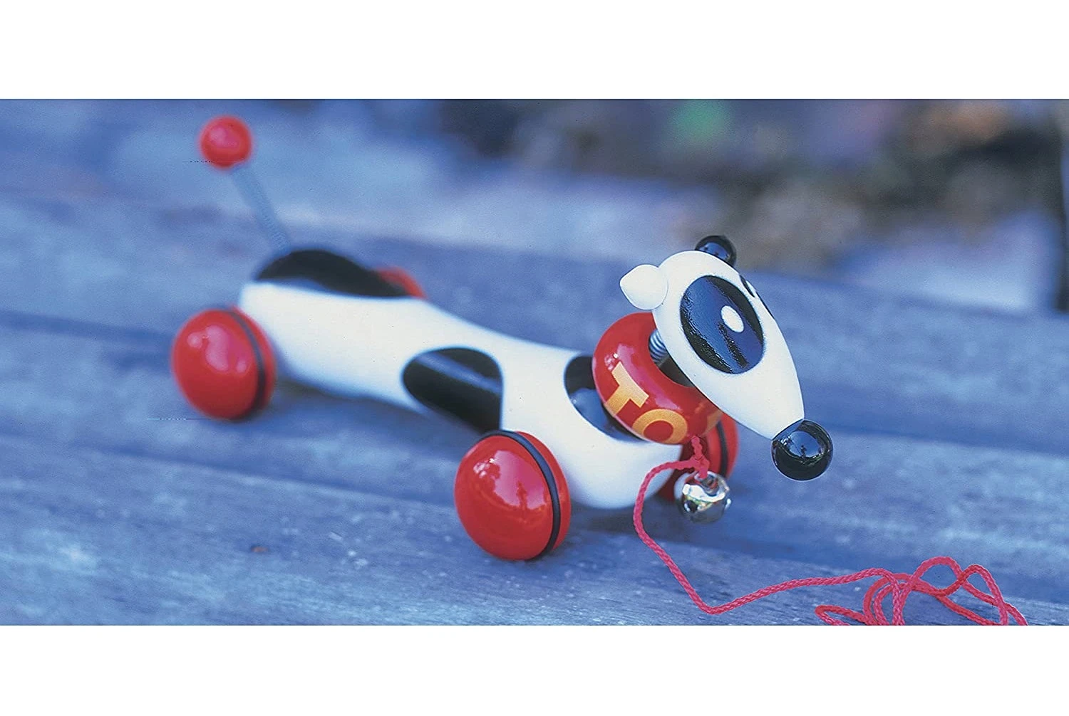 Quel plaisir pour boutchou de promener son chien noir, blanc et rouge en bois Toby. Vous l’entendrez venir grâce au grelot attaché à sa laisse. Ce joli teckel de 32 cm de long est livré dans une boite niche. Un jouet à traîner en bois fabriqué en France, dans le Jura, par la société VILAC. Réf : 1866
