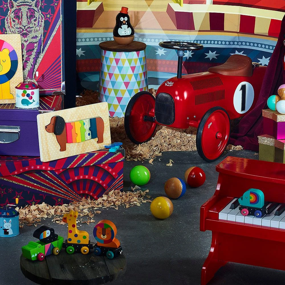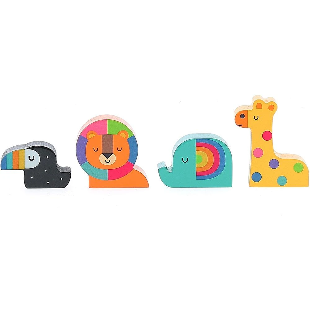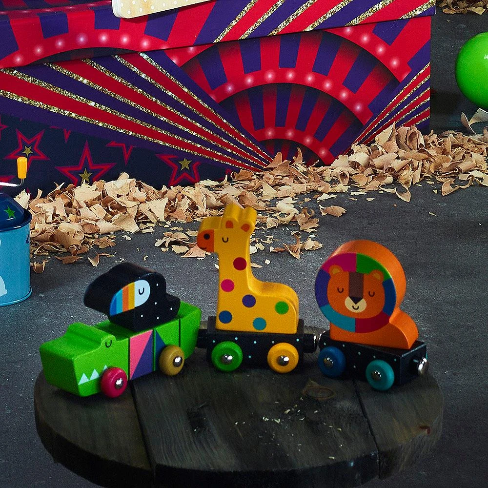 Une loco-croco surmontée d’un toucan, suivie de ses compagnons le lion, la girafe et l’éléphant arc-en-ciel. Ce joli petit train en bois permettra aux enfants de jouer avec ces animaux amovibles et interchangeables, puis de les remettre sur leurs wagons aimantés pour les promener.